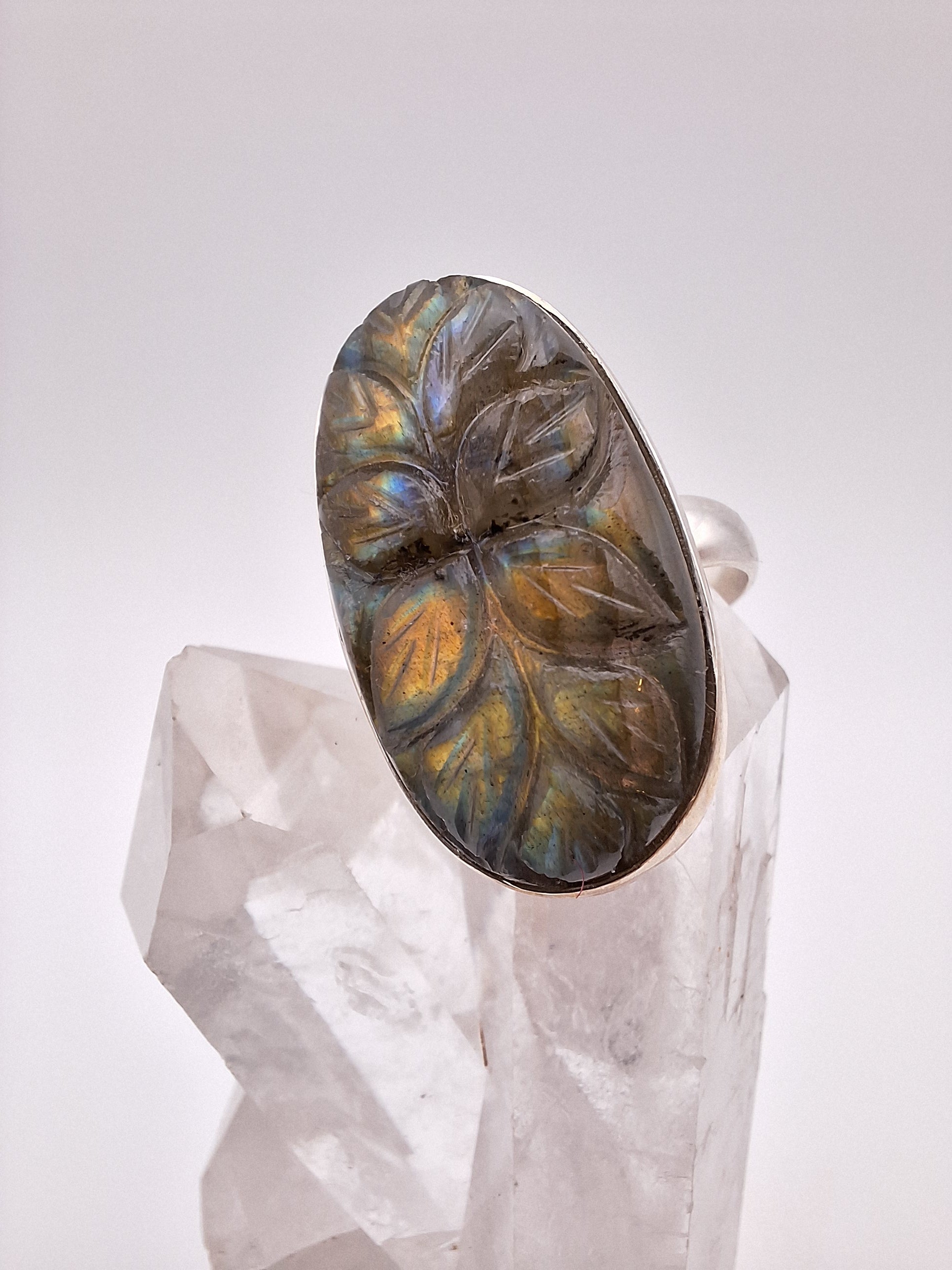 Elevate your style with this carved labradorite and sterling silver ring. Crafted with high quality silver and super-flashy labradorite, this ring is an absolute stunner.