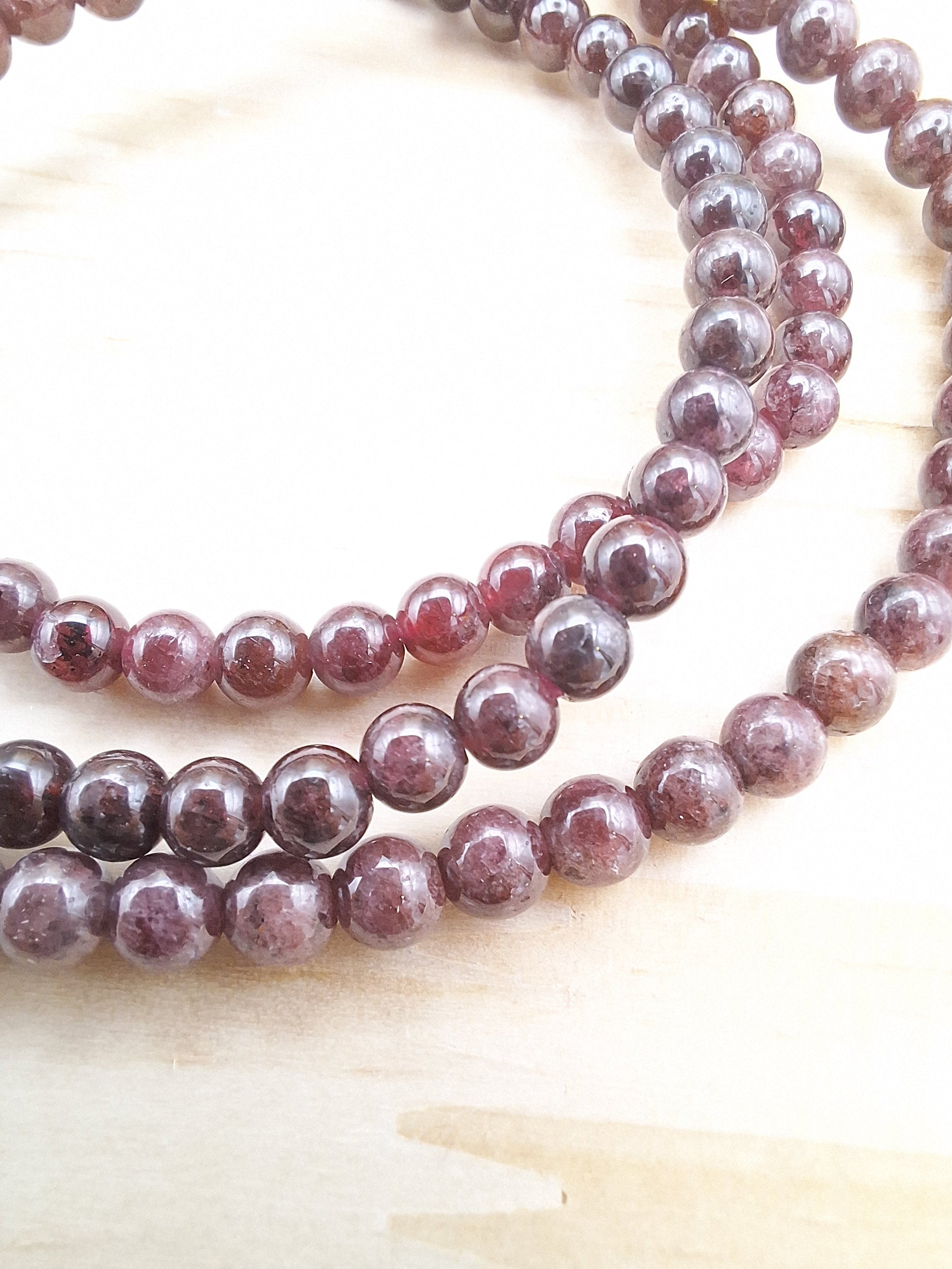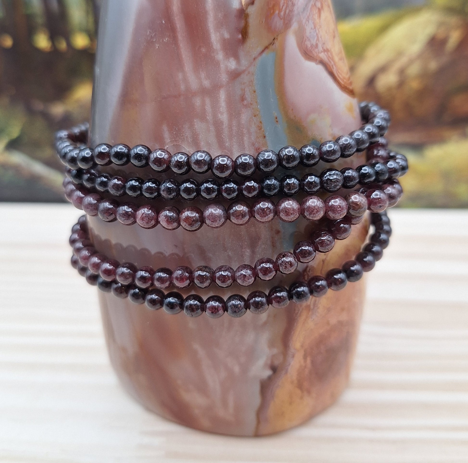 One gemstone beaded bracelet made with genuine cut and polished garnets. The beads in this piece are 4 mm in diameter. The depth of color and weight of this stone is intoxicating, and can be a soothing alternative to maladaptive coping mechanisms.