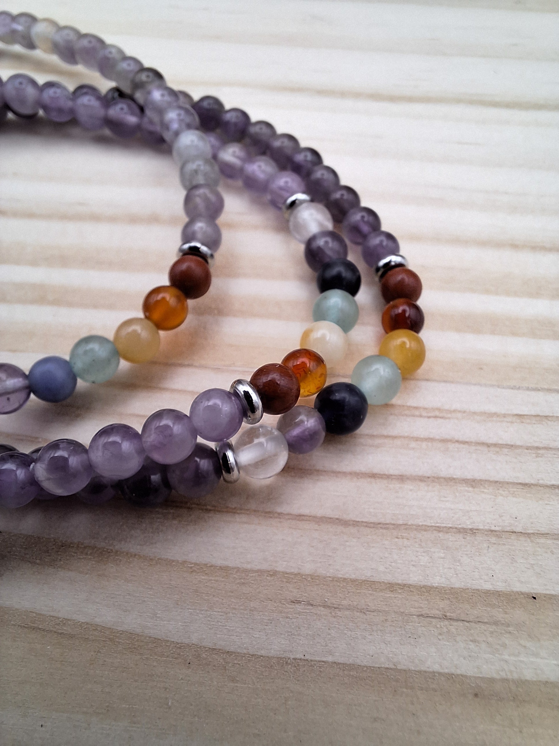 One gemstone beaded bracelet made with genuine cut and polished amethyst, along with seven other natural gemstones to represent each of your chakra centers. The beads in this piece are 4 mm in diameter. I noticed the quality of these beads right away! This composition really comes together beautifully with the dainty 4mm beads and the rainbow feature.