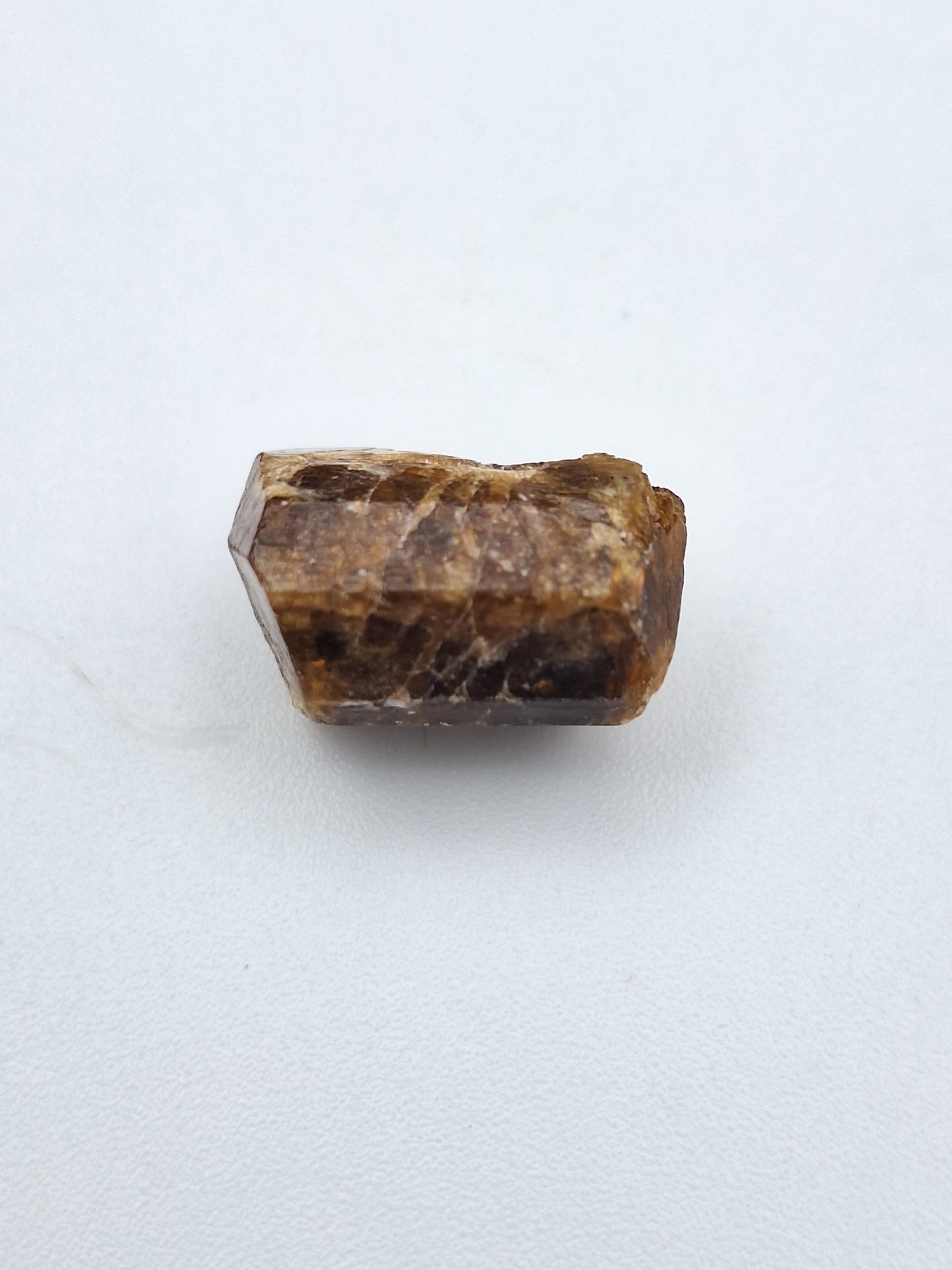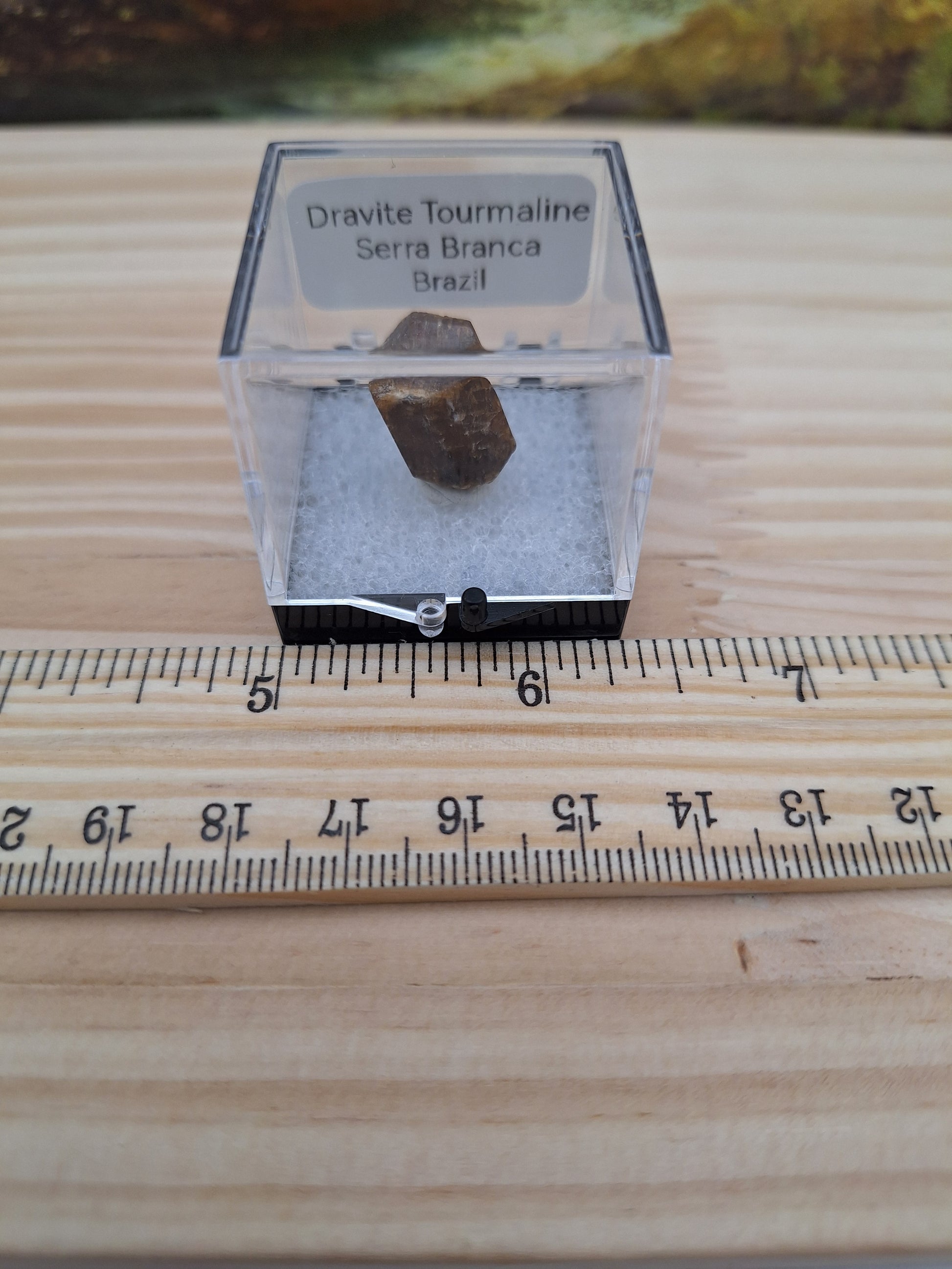 Dravite is the name of this brown variety of tourmaline. This specimen comes from Brazil, and has a beautiful termination, as seen in the photo. It comes in a little protective display case to keep it safe and dust-free.